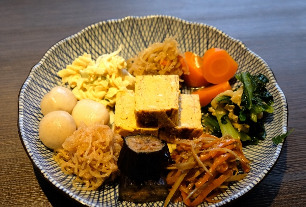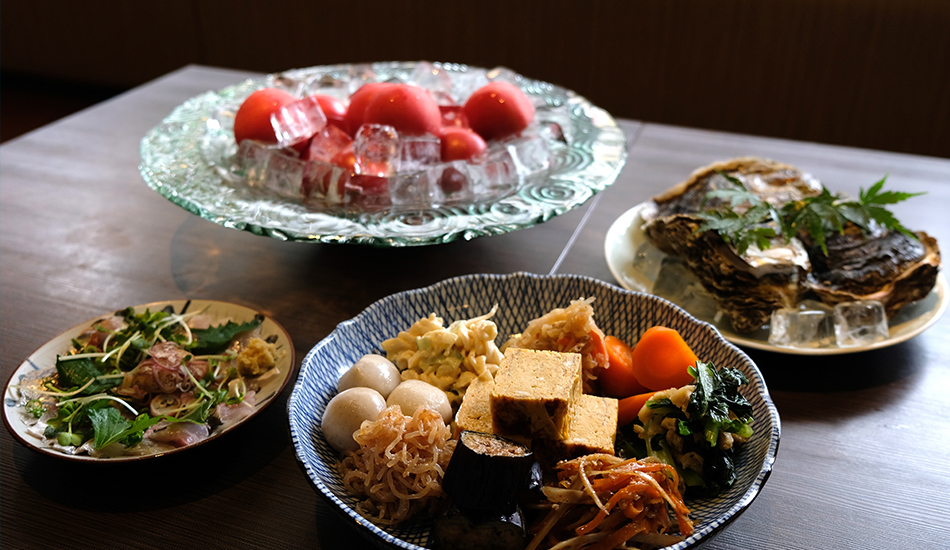 お酒と一緒に楽しみたいのが、季節の野菜を煮炊きしたおばんざい。週替わりで約10種類。単品300円、盛り合わせ1人前800円、2人前、1,000円、3人前1200円。多く注文するほどお得です。