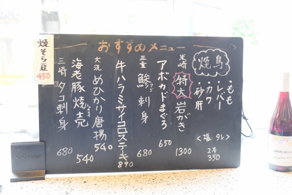 その他、豊洲市場で仕入れた新鮮な魚介類を使った料理も必ず注文したいところ。この日のおすすめが書かれた店内の黒板、要チェックです。