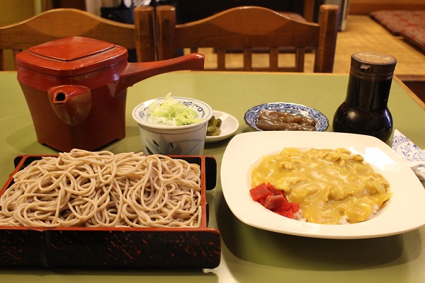 木・金・土は、このカレーを自慢のつゆで割った「カレー丼セット」1,050円を用意。そのほかカツ丼、焼肉丼、すき丼とのセットも。いずれもそば(掛けor盛り)+お漬物付きです。