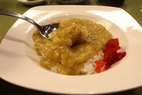 さてそのカレーライス、いただいてみると、ルーのコクと中華スープのまろやかな旨みにほどよくスパイスが香る、優しい味わい。豚の細切れと少し食感を残した玉ネギとのバランスも絶妙で、現代のカレーとは別物のおいしさです。