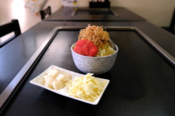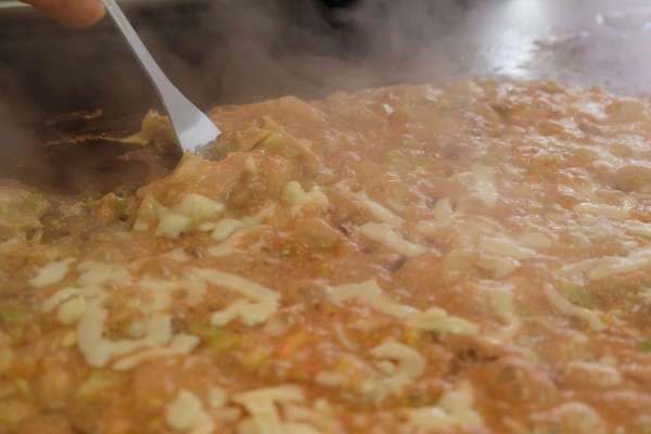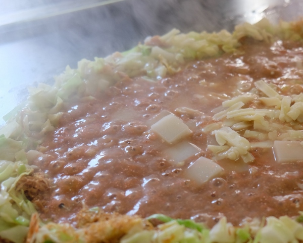 たっぷり入ったキャベツの食感、明太子の辛み、かつお出汁の風味、優秀な脇役・桜エビ、揚げ玉と切りイカ。そしてチーズとお餅。これらが絶妙なおいしさと食感をかもし出す「めちももんじゃ」。この店の一番人気です。