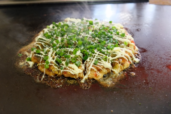 お好み焼きで人気なのが、大江戸天(1,100円)。豚肉、生イカ、桜エビ、紅しょうが、青ネギが入った、彩り良し、味良しの一品です。