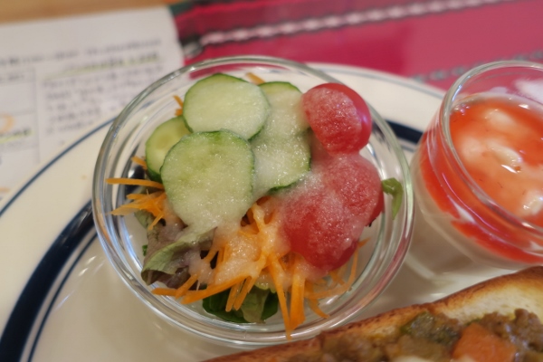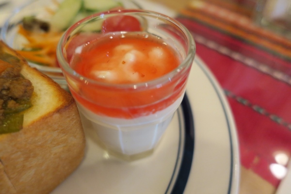 おかずトーストと、豆乳ヨーグルトドリンク、ミニサラダ、ミニ豆乳ヨーグルトがセットになって、11時半から14時まで1,050円! 単品で頼むよりとってもお得に楽しめちゃいます。
