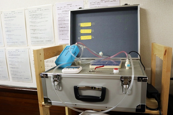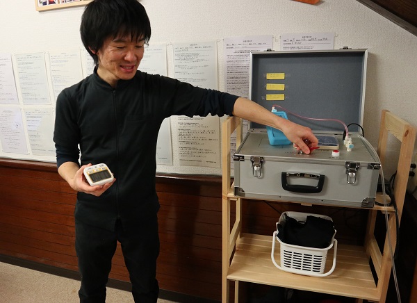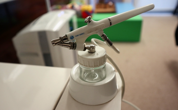 炭酸ミストをかけて(粒子が細かいので、服の上からでもOKだそう!)…