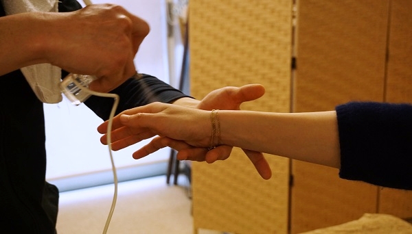 炭酸ミストをかけたあと、筋肉のバランスと関節の動きを調整。施術を受けている感覚は、コリをほぐされながら体の緊張がとれていく感じ。