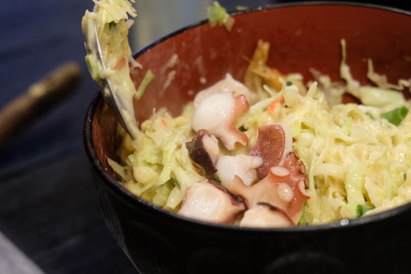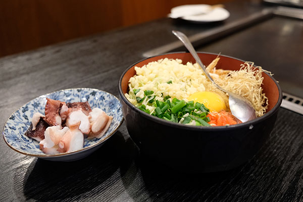 タコは刺身用なので、ぷりっぷりです。ベースのお好み焼きは、キャベツ・万能ねぎ・桜エビ・切りイカ・揚げ玉・紅ショウガ・生卵。