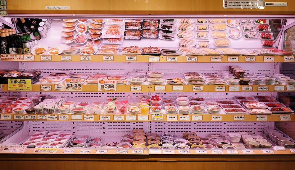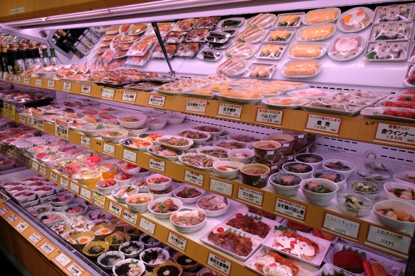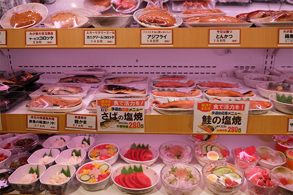 一人分づつ皿に盛りラップをした、日替わりや定番の料理が棚に並びます。