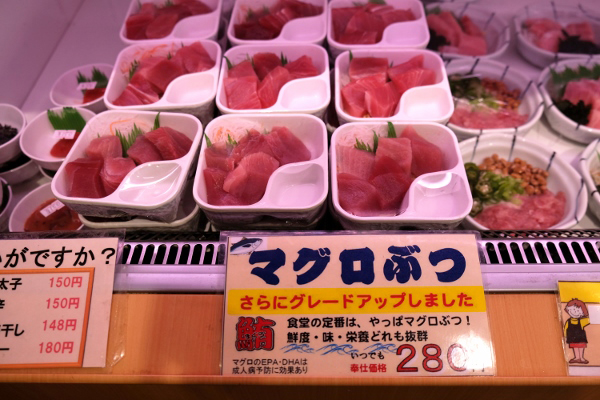 マグロぶつは一皿280円。通年おいしいマグロを提供するため、時期によって産地を変えて仕入れをしているんだとか。