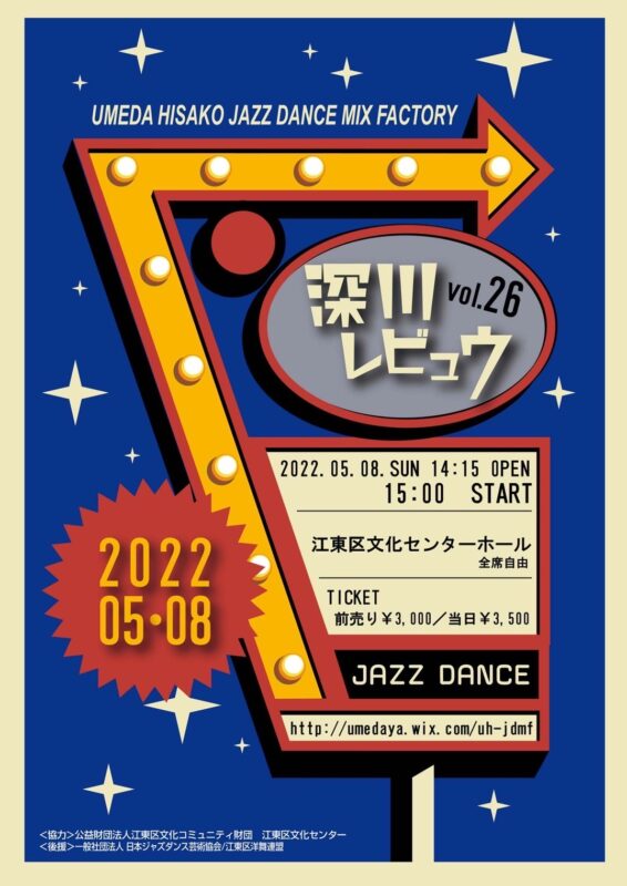 まずはどんなダンスなのか見てみたい、そんな方に朗報です。ゴールデンウィーク最終日の2022年5月8日(日)、江東区文化センターホールにて、上記でご紹介したウメダヒサコ先生振付・演出による「深川レビュウvol26」が開催されます。