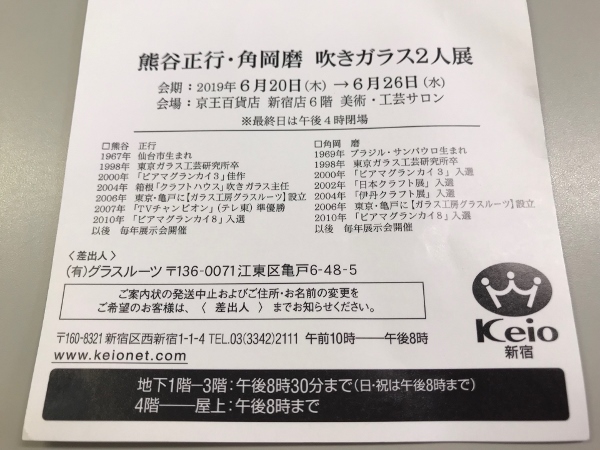 グラスルーツのおふたりにとって一年でもっとも大きな展示会が、毎年6月に新宿の京王百貨店で開催の「熊谷正行・角岡磨 吹きガラス2人展」。