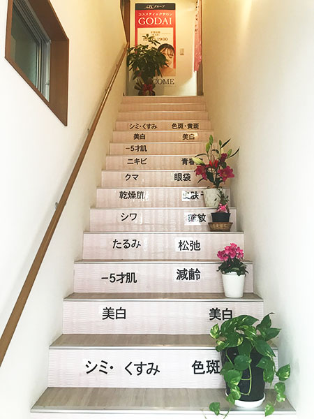 2階へ続く階段には「シミ・くすみ」「美白」「たるみ」「シワ」など、私たちが気になるワードが。