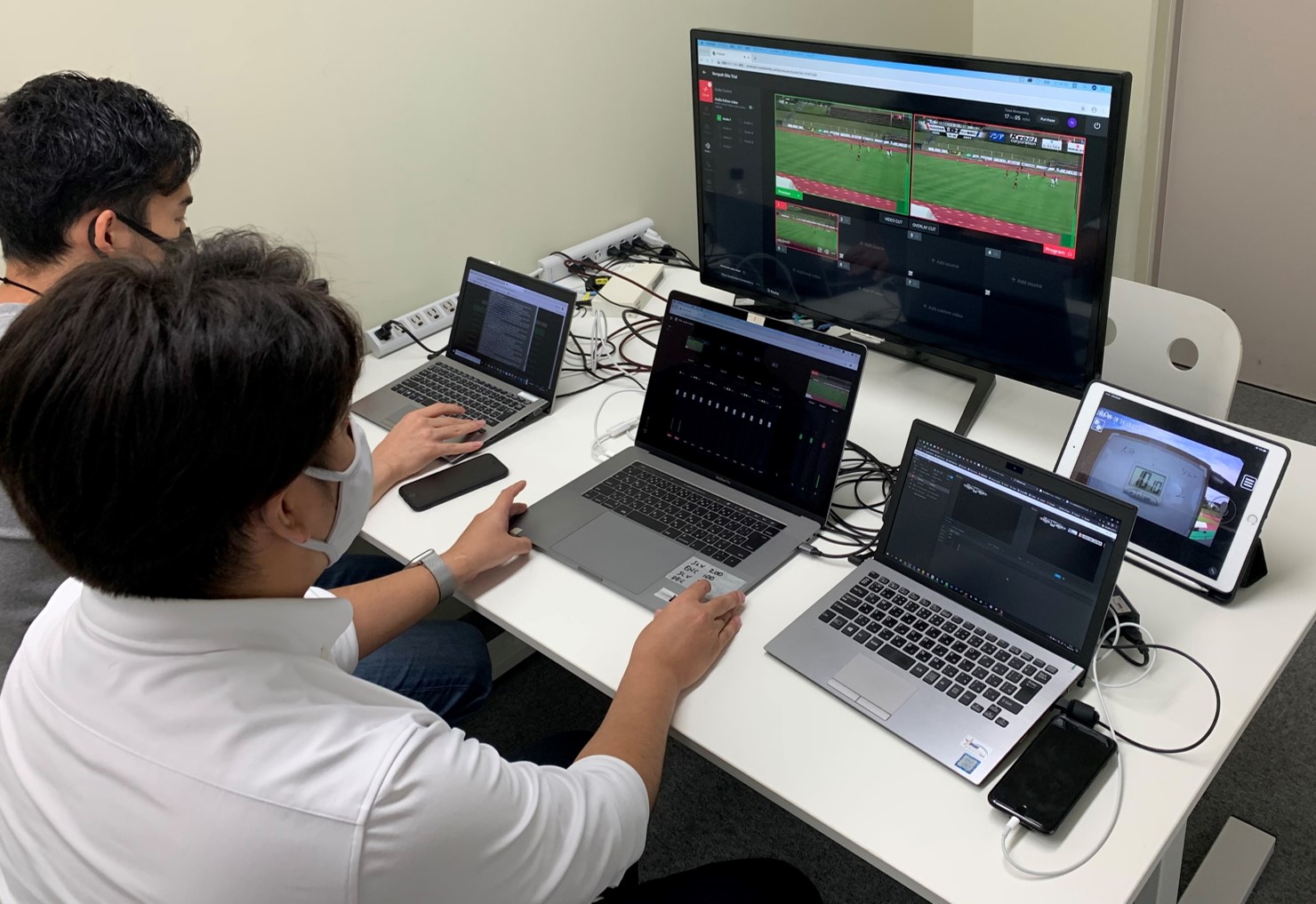 ▽大分の試合会場からリアルタイムで送られてくる映像にテロップなどを入れる作業を、東京の社内で行う様子。