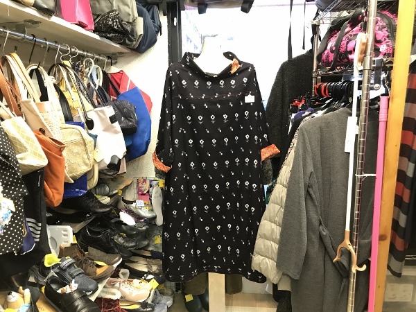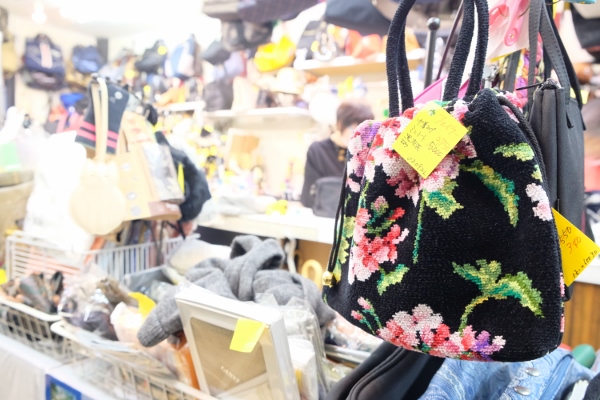 ものすごい量のユーズドや未使用の婦人服、バッグ、アクセサリー、財布、食器やタオルなどの日用品などが所狭しと並びます。