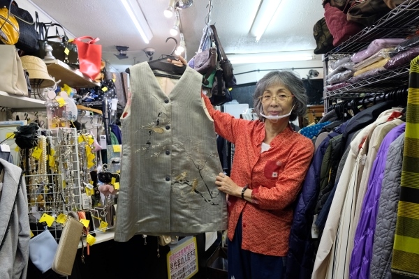 その他、服のオーダーも受け付けているそうです。こちらは、お客様の依頼で、使わなくなった帯と着物を使って仕立てたベスト。