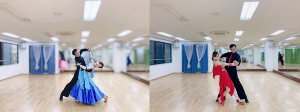 社交ダンスは、ワルツやタンゴなどの「スタンダード」(写真左)、サンバやルンバといった「ラテン」(右)の2つに大別されます。こちらのスタジオではその10ダンスだけでなく、ブルースやジルバなどの「パーティーダンス」やサルサやアルゼンチンタンゴなどの「クラブダンス」まで、希望に応じて幅広く学べます。