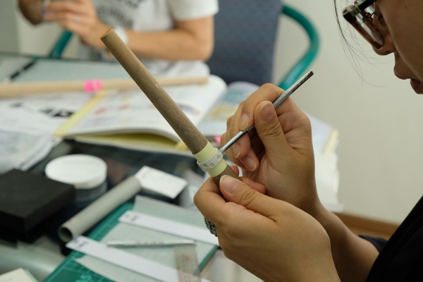 乾いたら微調整。ヒビが入ってしまったところや、凸凹しているところをペーストで修正し、研磨用のスポンジで表面を磨き上げます。