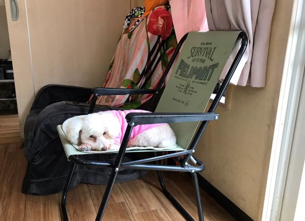 東砂の美容室、入り口横の椅子を定位置にお客様をお出迎えするのはトイプードルのリョウくん(13歳♂)。