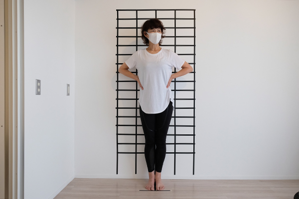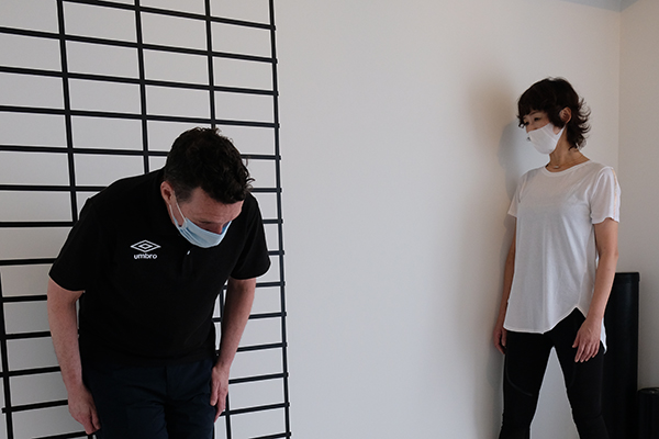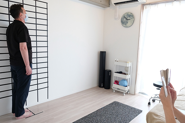 パソコン作業が多いせいか、右腕に痛みを感じているとのこと。線が描かれた壁の前に立ち、体の前後・両側面から撮った写真を見て、体の状態を確認します。