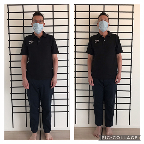 △体のゆがみはあるものの、筋肉の緊張がゆるみ、前かがみ気味で壁につかなかった背面が頭から足まで壁につくようになりました。