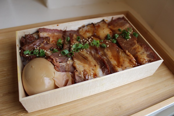 そして売り切れ御免の限定メニューがこちら、「ローストポーク重」1,100円。炊き立てご飯の上に肩ロースと豚バラの2種のローストポークを敷き詰め、ローストした際の肉汁をタレに使った贅沢な逸品。