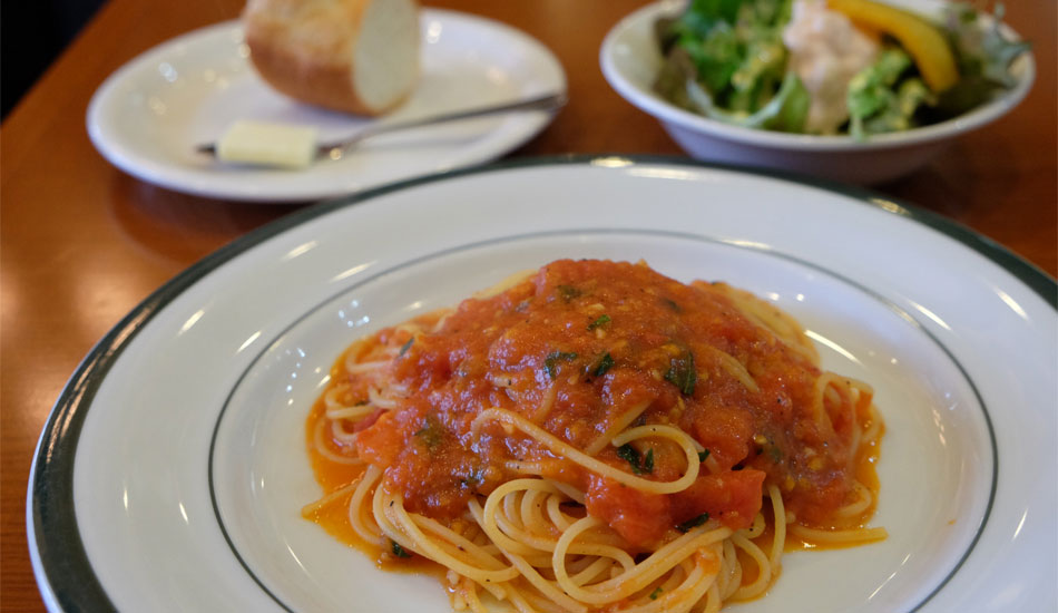 トマトの酸味と爽やかな大葉の相性バッチリ、ガーリックの効いたアツアツのパスタ。お客を満足させるシェフの本気を感じます。