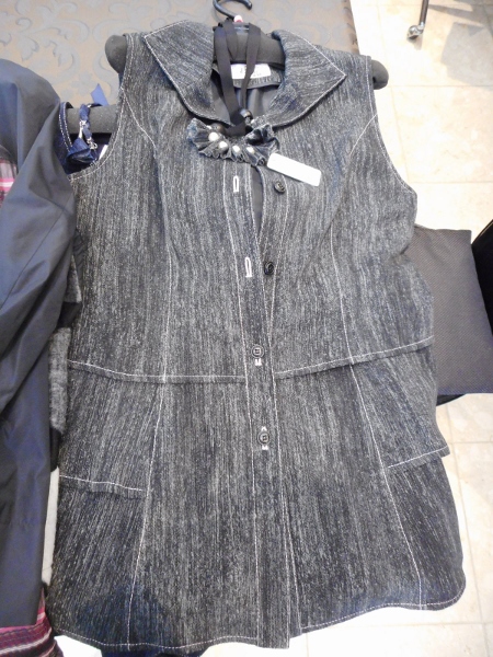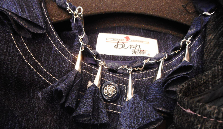 というわけで、今回はお洋服。ラックにかかっている品物は、すべて京都丹後からのお取り寄せもの。こちらのトップス、一見デニムに見えますが、正体はなんと縮緬!普段着物などに使われるソアロンのトリアセテート繊維からできているらしいです。
