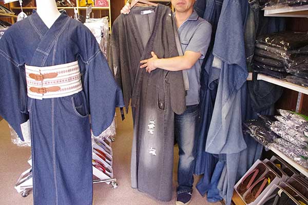 少しちょい悪な感じのクラッシュデニム着物もありました。サイズはS~3Lまで用意し、ノーマルタイプのデニム着物は8,980円。
