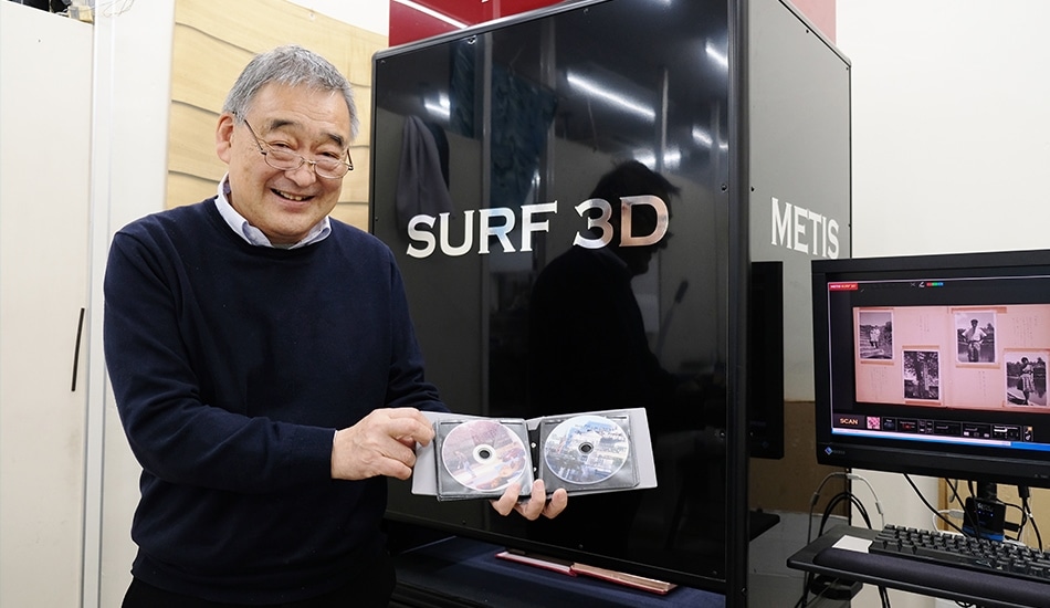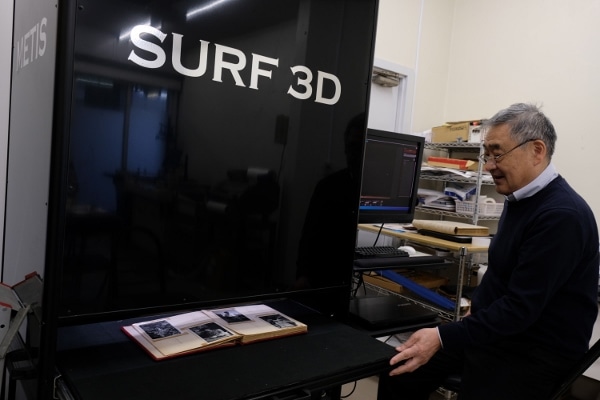 様々な角度から12回ライティングしてスキャンします。このライティングによってアルバムに貼られたテープなどのテカリが補正させるんだとか。