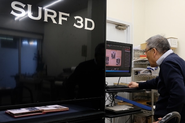 このハイスペックなスキャナーでスキャンしたデータから、パソコンを使い、1枚切り抜いて補正する様子も見せてもらいました。