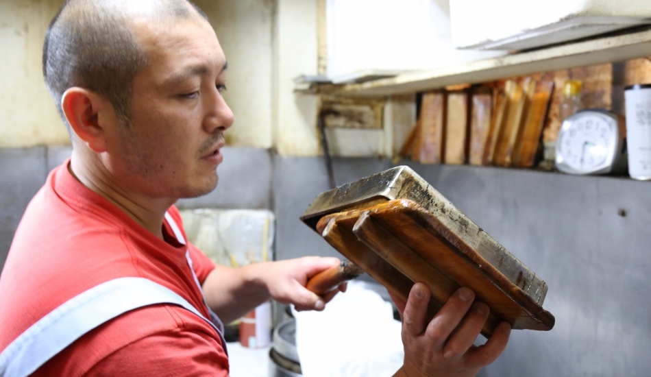 下駄でぐっと押すのは角をしっかり焼くため。