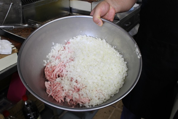 ピンク色の茨城産ポークと玉ネギがたっぷり。