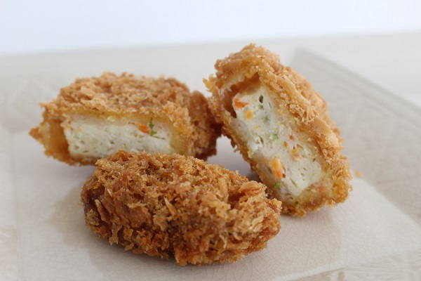 豆腐カツ72円は豆腐に野菜と香辛料を加えて揚げた、女性に人気のヘルシーメニュー。しっかり味がついているのでそのままで美味♡