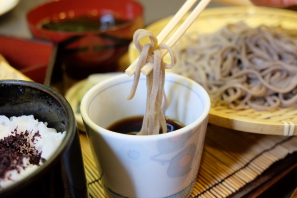 この店の板前さんが作る煮物などのおかず・ご飯・汁物がついた栄養バランスの良いそば定食。3種類から選べるというそばですが、今回は一番ポピュラーな、蕎麦の実を丸ごと(殻以外)挽いて作る「江戸前」を合わせました。