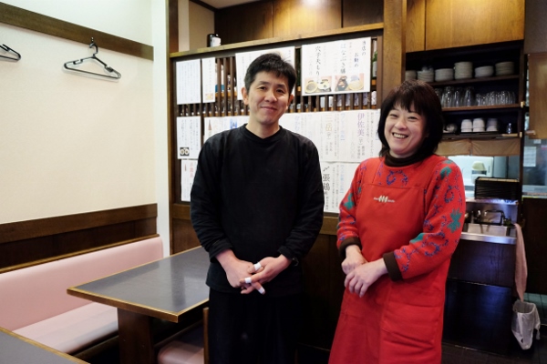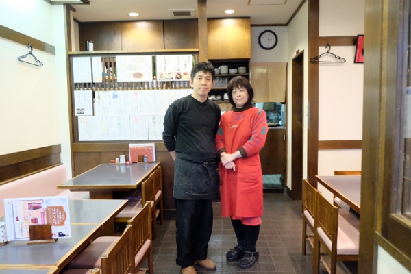 そば職人として修行の後、1994年に父の名にある漢字を訓読みで屋号にし、生まれ育ったこの地で自宅を改装して店主になった織間正人さんと、妻のはるみさんです。