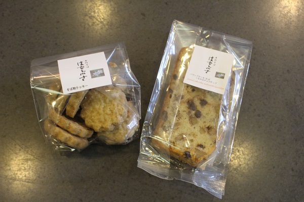 お土産としても人気のそば粉パウンドケーキ280円とそば粉クッキー420円。