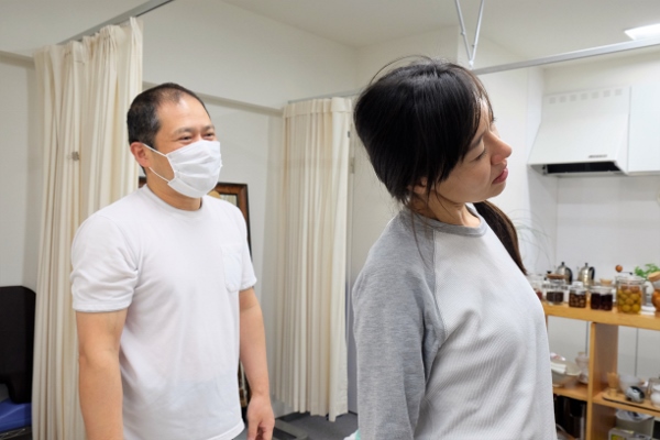 お借りしたウェアに着替えてから、コリや痛みの原因となっている箇所を突き止めていきます。