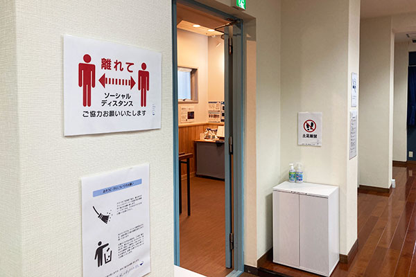 出入口にアルコール除菌スプレーとジェルを設置し、北と南の壁面に大きな窓があるので、開ければ換気も良好。ソーシャルディスタンスを促すポスターもありました。