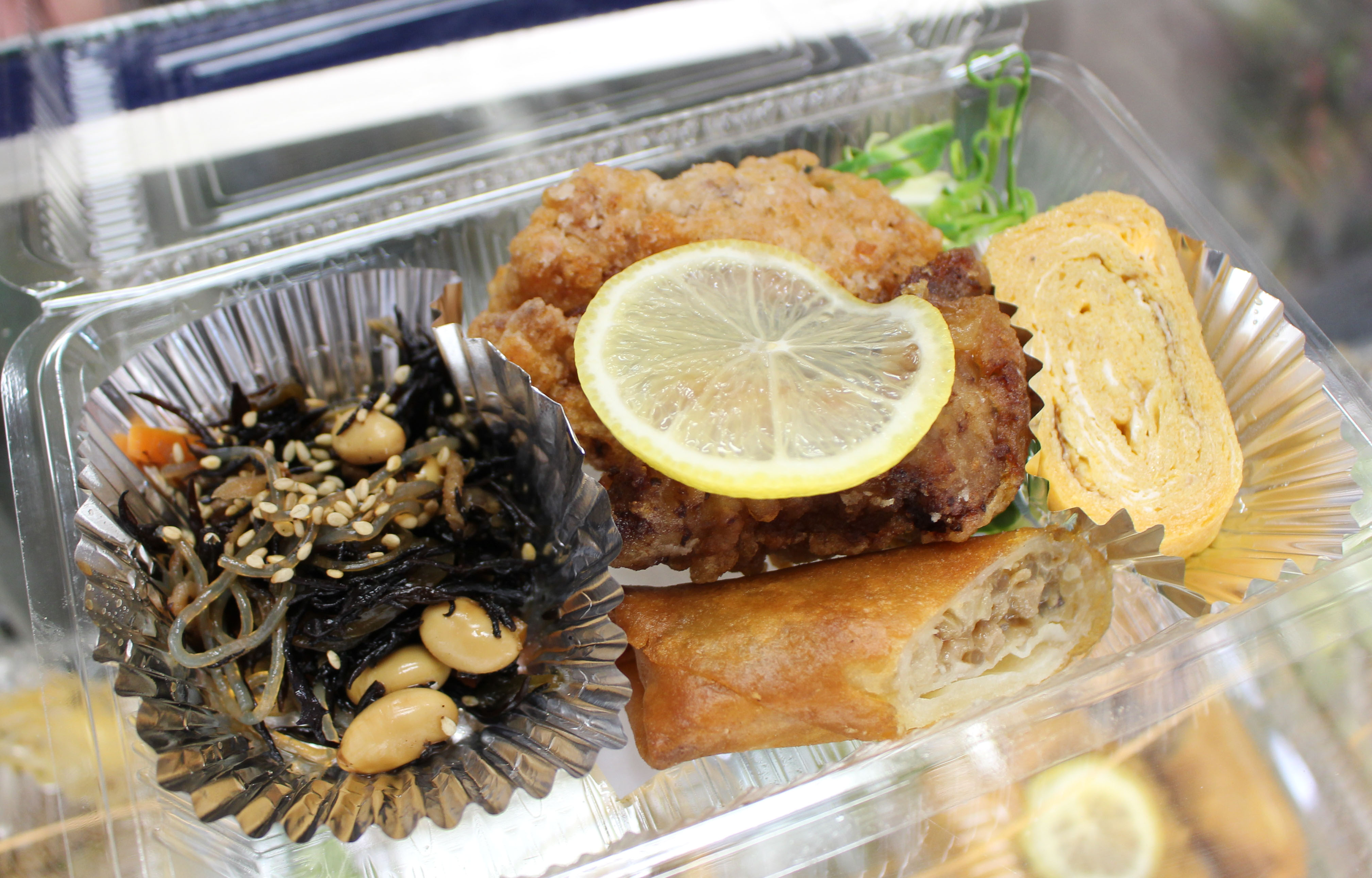 春巻き、唐揚げ、シャケ、こっそりメニューでエビフライも。全部ゆき子さんの手作りです。