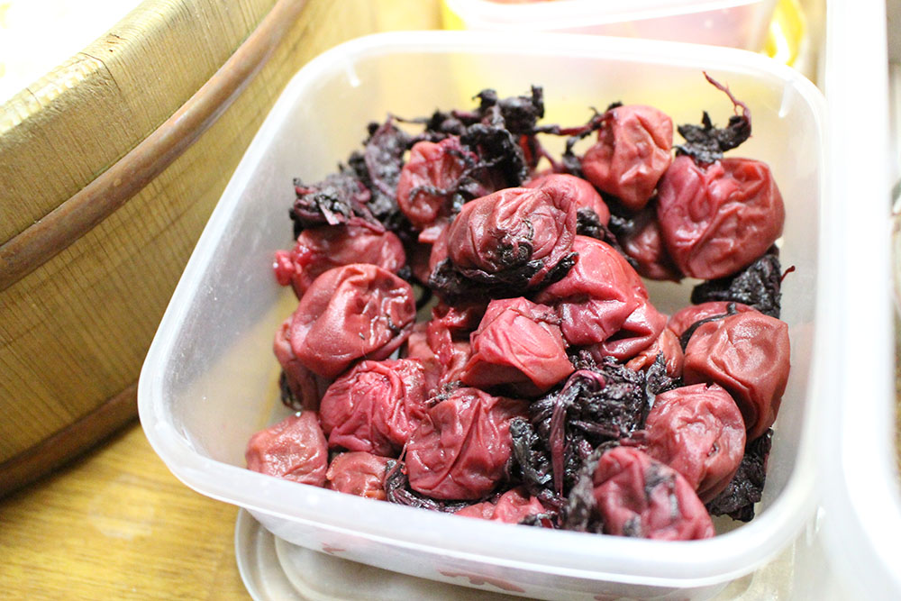一番人気の自家製梅干しは、ゆき子さんのお母さん(92歳・鹿児島在住)の手作り。これを丸ごと入れます。