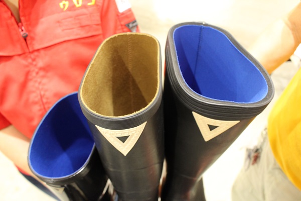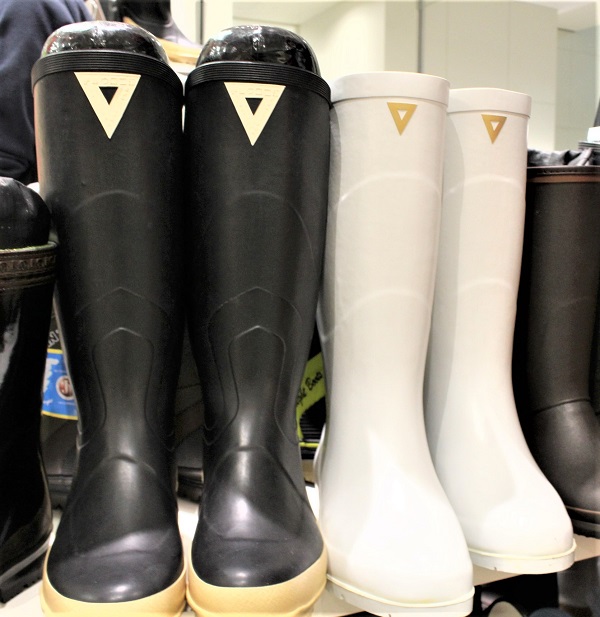 こちらがオリジナル商品「白底付大長(通称・白ウロコ)」(左)と、白色も欲しい!というお客さまの声から生まれた特殊な「ホワイトクリーン衛生大長」(右)※白はオール耐油製品(限定数)