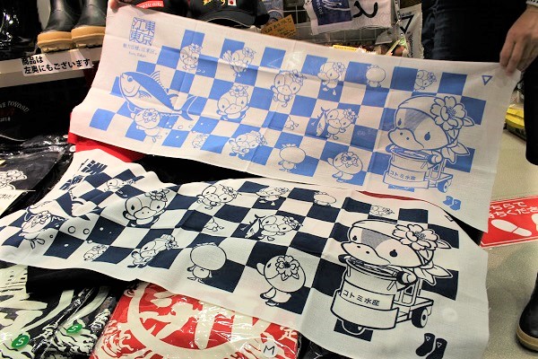 数あるグッズのなかでも今のイチオシは「江東区観光キャラクターコトミちゃん」がたくさん描かれた手ぬぐい。1枚1,100円(税込)。他に市場オリジナル手ぬぐいは6~7種類!1枚970円(税込)~。