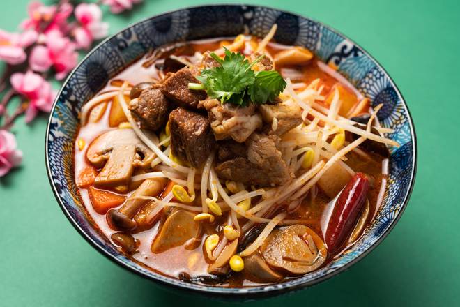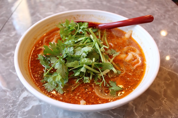 真っ赤なスープにパクチーどっさりのビジュアルに心を躍らせつつ、まずはスープを一口。鶏ガラベースに花椒と唐辛子のパンチが効いたスープは、程よい酸味で以外にもあっさり。肉みそとパクチーのうま味と香りが重なって、複雑なおいしさが口いっぱいに広がります。
