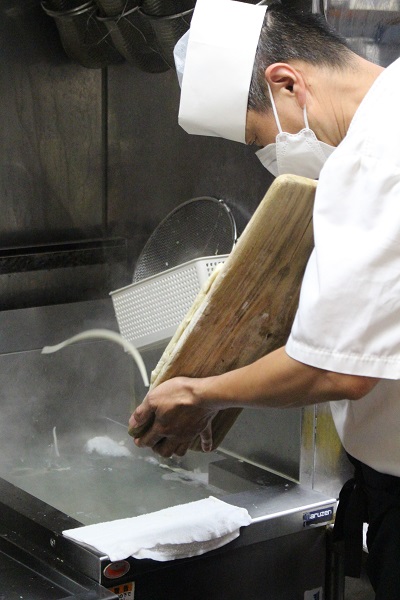 その麺を茹でるところ、カウンター席越しに見ることができます!一定間隔でリズミカルかつスピーディに削っていく職人技、思わず見入ってしまいます。