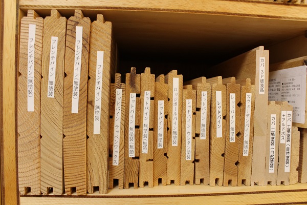 △打ち合わせスペースには天然木のサンプルがズラリ。足を踏み入れると木の香りが漂います
