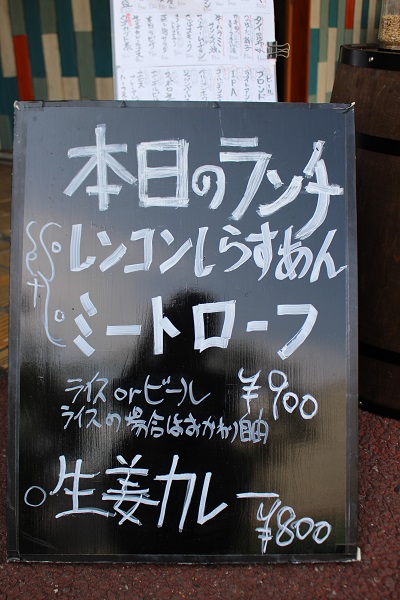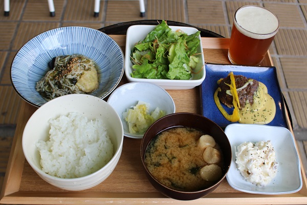 △本日のランチ、レンコンしらすあん&ミートローフ。撮影用にご飯とビールを用意していただきました
