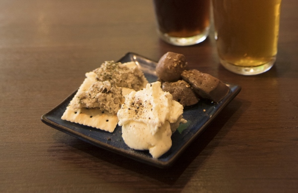 いぶりガッコとチーズが絶妙な食感と風味のポテトサラダ、サバのリエット、下町レバというラインナップ。(それぞれ単品メニューあり)