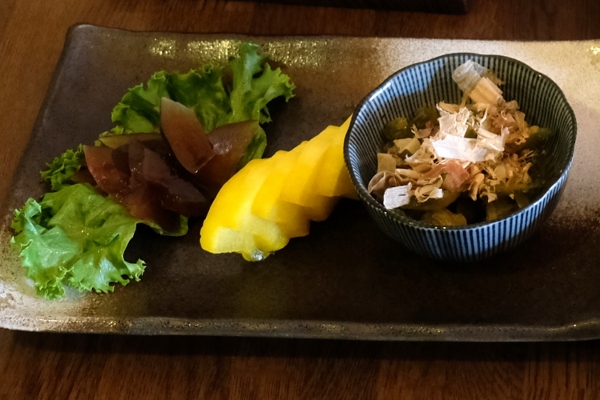 こちらも店主の自信作、沖縄漬け物3点盛り(600円)。