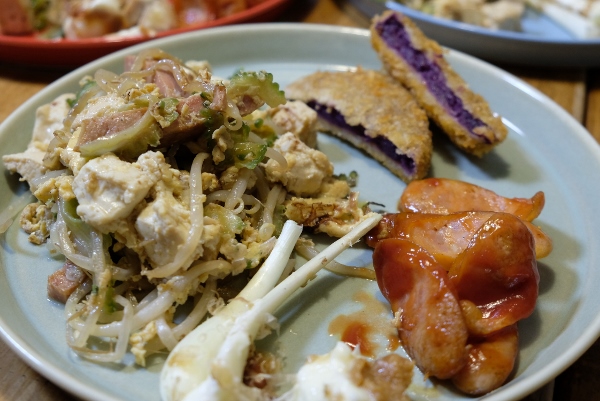 この日、わが家の食卓に並んだのは、大城屋さんのゴーヤチャンプルー、紅イモコロッケ、ポチキソーセージ、島らっきょ。