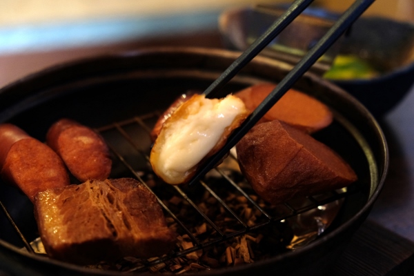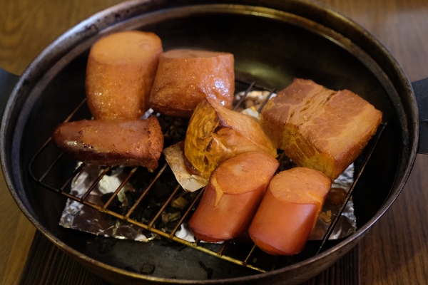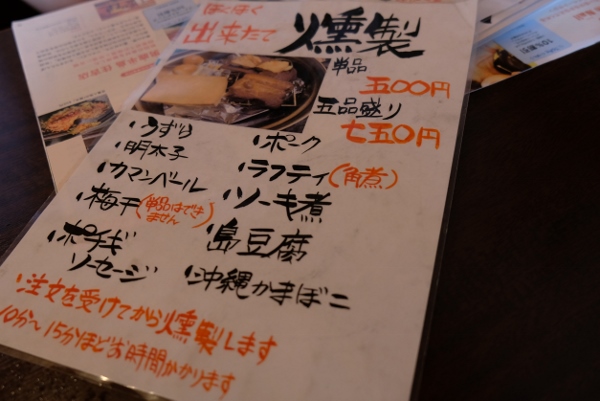 蓋をして完成まで約10分。注文後にテーブルで燻すので、待つ間に香りも楽しめます。燻製用の食材は10種類。単品だと500円で、五品盛りが750円。
