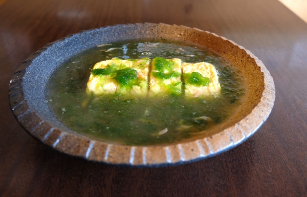 特製のだし巻き玉子を沖縄そばのスープに入れて、沖縄の岩場に生える海藻で「あおさ」とも呼ばれるアーサーを加えた、この店の名物料理のひとつ。